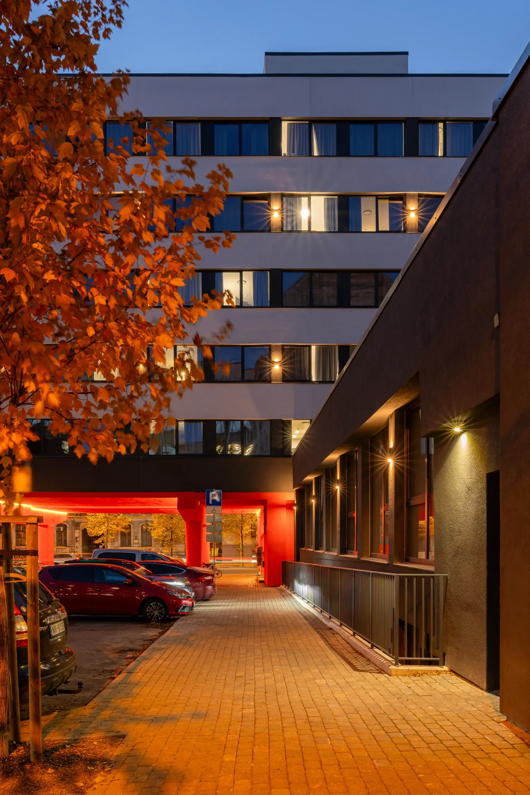 Projekta mērķis bija efektīvi un pēc iespējas ātrākā laikā pārvērst padomju laikā būvēto bloku biroju ēku par modernu uz ārzemju studentiem tendētu daudzdzīvokļu-kopmītņu ēku, veicot gan pilnu iekšējo pārbūvi un ēkas energoefektivitātes paaugstināšanas pasākumus. Klienta prioritātes bija ekonomiski pamatoti risinājumi un arhitektoniski moderna ārējā tēla kvalitāte.