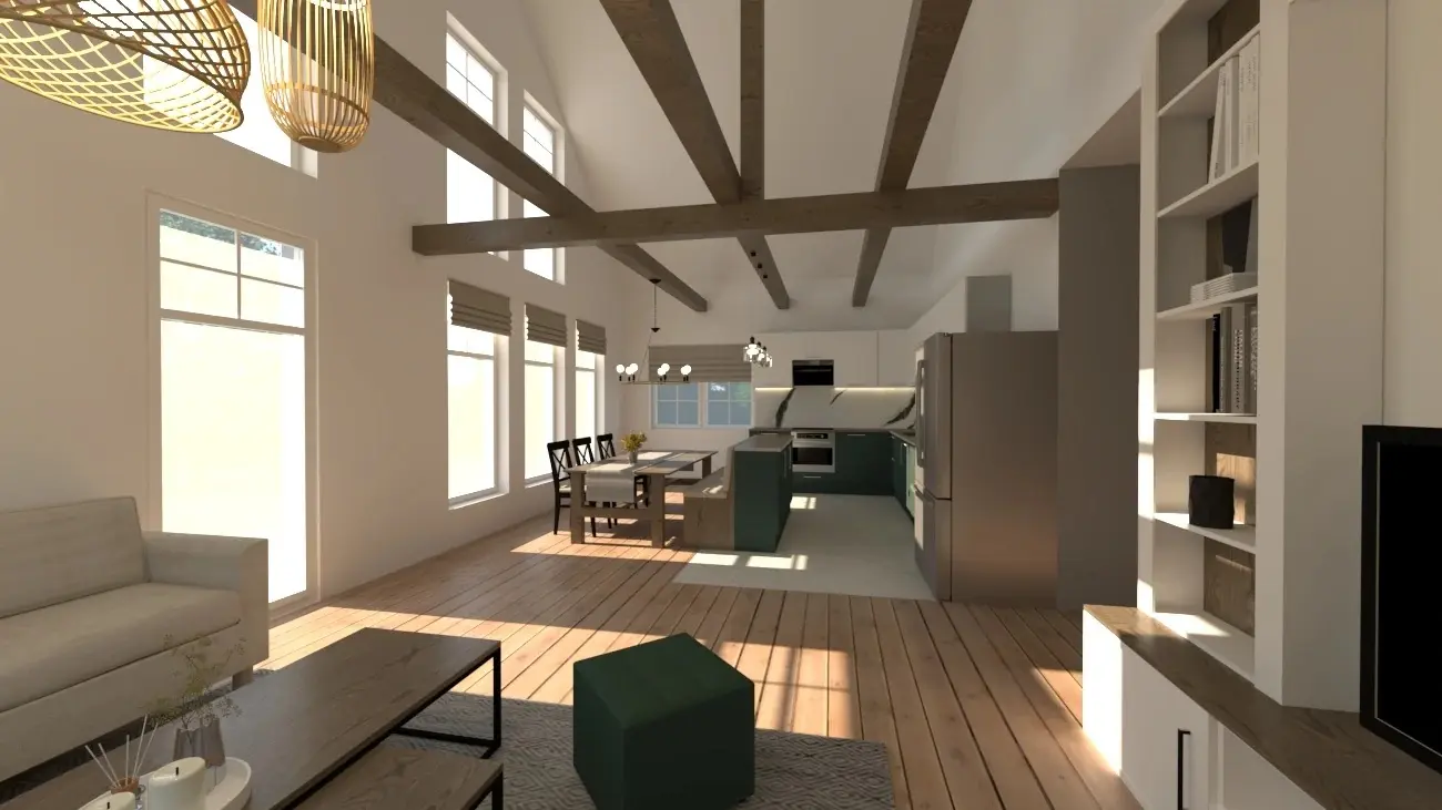 Pasūtītāja ar vīru esošas mājas renovācijas laikā atdūrās pret problēmu virtuves zonā ar dzīvojamo istabu. Nebija zināma skaidra vīzija, kas tieši šajā telpā iederētos un būtu funkcionāls. Bija zināmas krāsu gammas virtuvei un aptuvenais virtuves izvietojums, taču bija vēlme to papildināt ar šauru virtuves salu un lielāka izmēra esošu ēdamgaldu. Dzīvojamai zonai bija zināms tikai tas, ka vajag mīkstās mēbeles, TV un kafijas galdiņu.